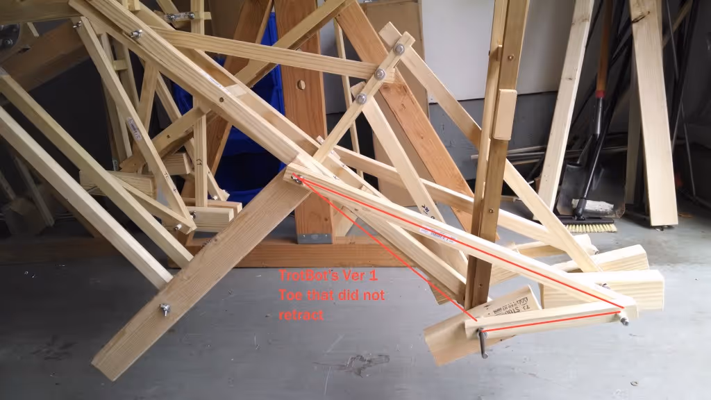 Next, we explored adding some sort of toe that would push down on the ground as the foot begins to lift, just like how humans use their toes to walk. We installed one of these toe ideas on our large TrotBot but they didn't smooth the gait enough, and since they were attached to the legs at a fixed angle they tended to catch on obstacles. Catching on obstacles occasionally caused the linkage to lock and gears to grind. In other words, this toe compromised our main goal of creating a mechanism that could walk on rough terrain! Here's a photo of that toe.