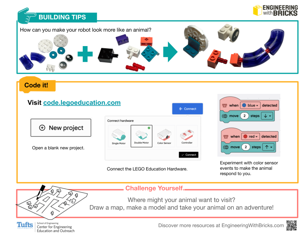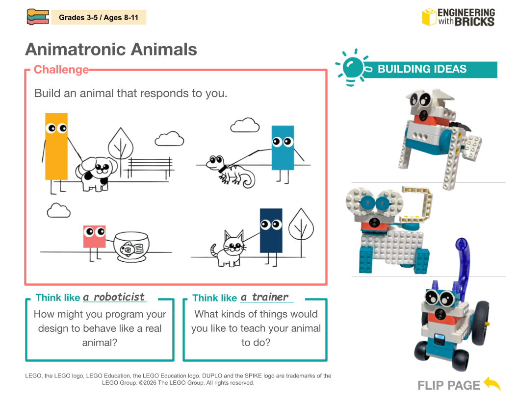 In this activity, students design an animatronic animal and use color sensor events to program motor and sound sequences. Students decide what different colors represent and program the animals behaviors to match each color situation accordingly.