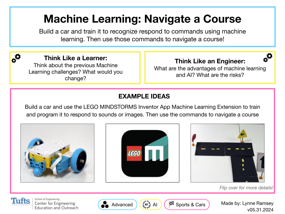 This activity requires students to use what they learned from the previous two activities and train a car to respond to sound or images in order to navigate a course.