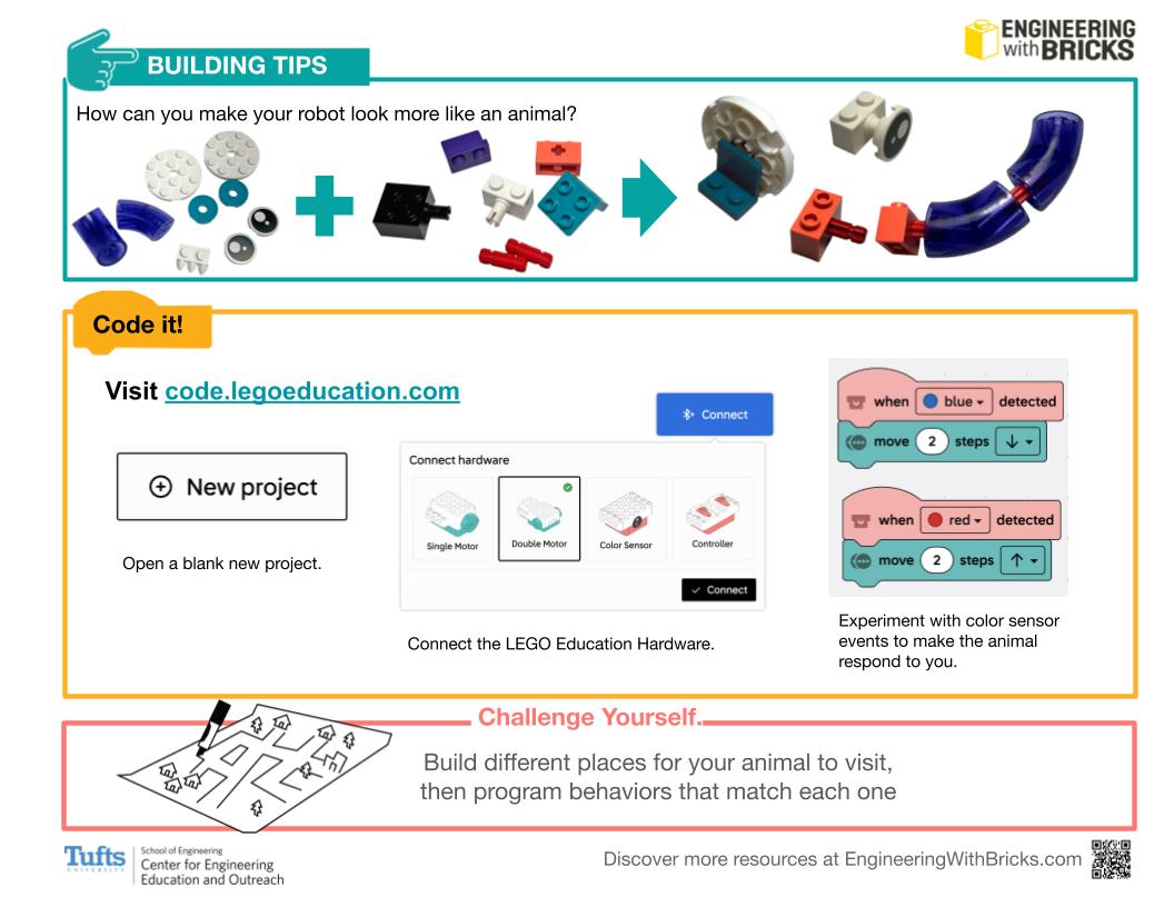 In this activity, students design an animatronic animal and use color sensor events to program motor and sound sequences. Students decide what different colors represent and program the animals behaviors to match each color situation accordingly.