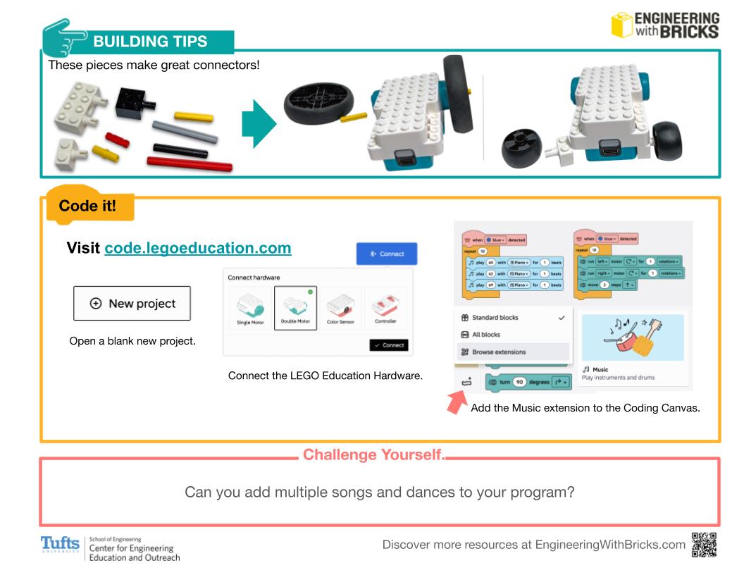 In this activity, students design and program a character that dances to custom music. Students will add the Music Extension to the Coding Canvas to unlock code blocks that play musical notes from various instruments. With these new blocks, students will program songs and dance moves for their character to perfom.
