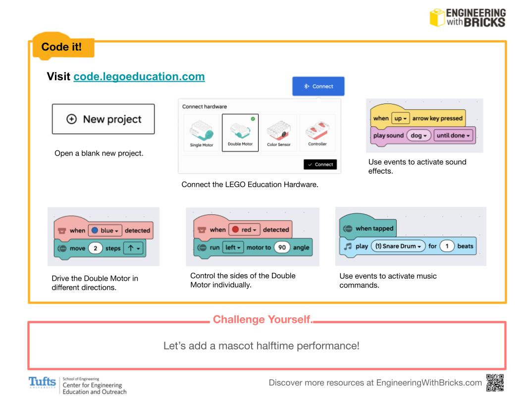 In this 2-session activity, students design a custom mascot for a real or imaginary sports team. Using sequences, color sensor events, and loops, students program the mascot to perform different movements, including special reactions for when their team is winning or losing. Teams may also design a sports arena and create props for their mascot to use during its performance.